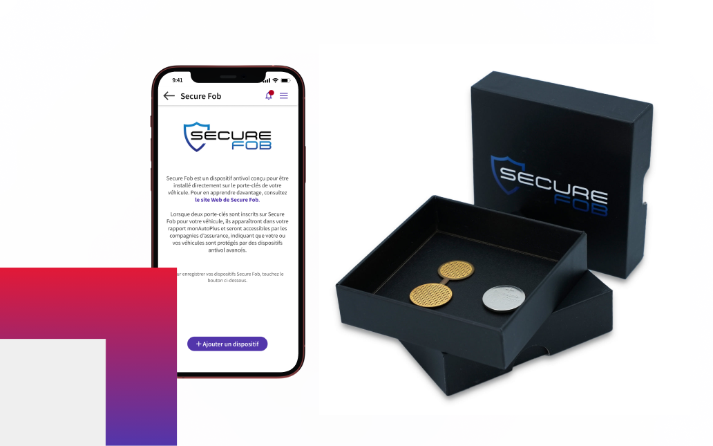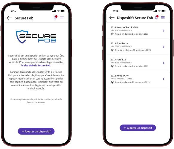 En enregistrant votre dispositif antivol approuvé et associé à votre véhicule, vous signalez aux assureurs privés canadiens que votre véhicule (identifié de façon unique par le numéro de série du NIV) est protégé par un système antivol amélioré offert sur le marché secondaire de l’automobile. En fonction de l’année, de la marque et du modèle de votre véhicule, de sa prédisposition actuelle au vol, de l’endroit où il est conduit et stationné et de l’efficacité de votre dispositif antivol, vous pouvez parfois bénéficier de réductions sur votre prime d’assurance ou d’autres mesures incitatives de la part de votre compagnie d’assurance. Remarque : La prise en charge par votre assureur n’est pas garantie; elle est laissée à la discrétion de chaque assureur et les conditions peuvent varier d’un assureur à l’autre.